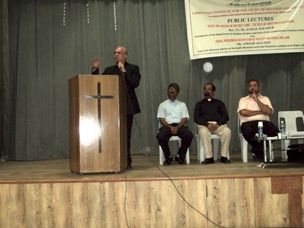 30.07.2012. Kairos Palestine and BADIL Resource Center for Residency and Refugee Rights (BADIL), recently participated in a 12 day speaking tour throughout India. The tour was organized by the Indian Solidarity Ecumenical Network Palestine (ISEN-P)[1]which was established less than a year ago, as a response to Kairos Palestine, to uphold Palestinian rights and to advocate an end to Israel’s longstanding impunity. ISEN’s main focus is to challenge the Zionist interpretation of the bible and its misused justification of Palestinian suffering; to raise awareness within Indian society as to the political and legal reality in Palestine; and to reach out to Indian policy makers and politicians in order to positively influence their decisions towards the situation in Palestine and Israel.