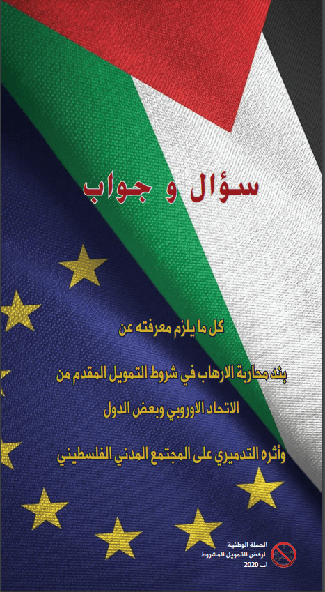 - 2020 - سؤال وجواب: كل ما يلزم معرفته عن بند محاربة الارهاب في شروط التمويل المقدم من الاتحاد الاوروبي وبعض الدول، وأثره التدميري على المجتمع المدني الفلسطيني