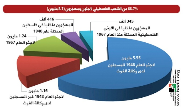 [2] 5,545,540 M 1948 refugees registered with UNRWA, 1,161,812 M 1948 unregistered refugees, 1,237,462 M 1967 refugees, 415,876 internally displaced inside the Green Line and 344,599 internally displaced in the oPt. BADIL Survey 9th Edition (under final review).
