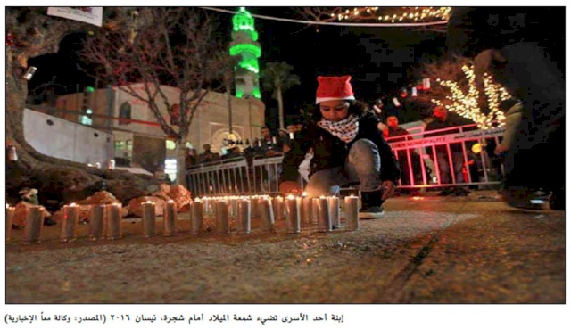 هزي جذع النخلة كي احيا، يا عذراء العذارى ، خلصينا من هذا الورم الخبيث الذي يسمى الاحتلال، وخلصينا من ثالوث اسرائيل الدنس المتمثل في العنصرية والتطرف الديني والفساد الاخلاقي والجنون، خلصينا من قوانين النهب والاستيطان على ارض ليست لهم، خلصينا ممن يسرقون مياهنا ويحرقون اشجارنا ويعدمون اولادنا، ومن عنف دولة اسرائيل المنظم، اصغي الى صلواتنا واستجيبي لنا، آمين آمين.