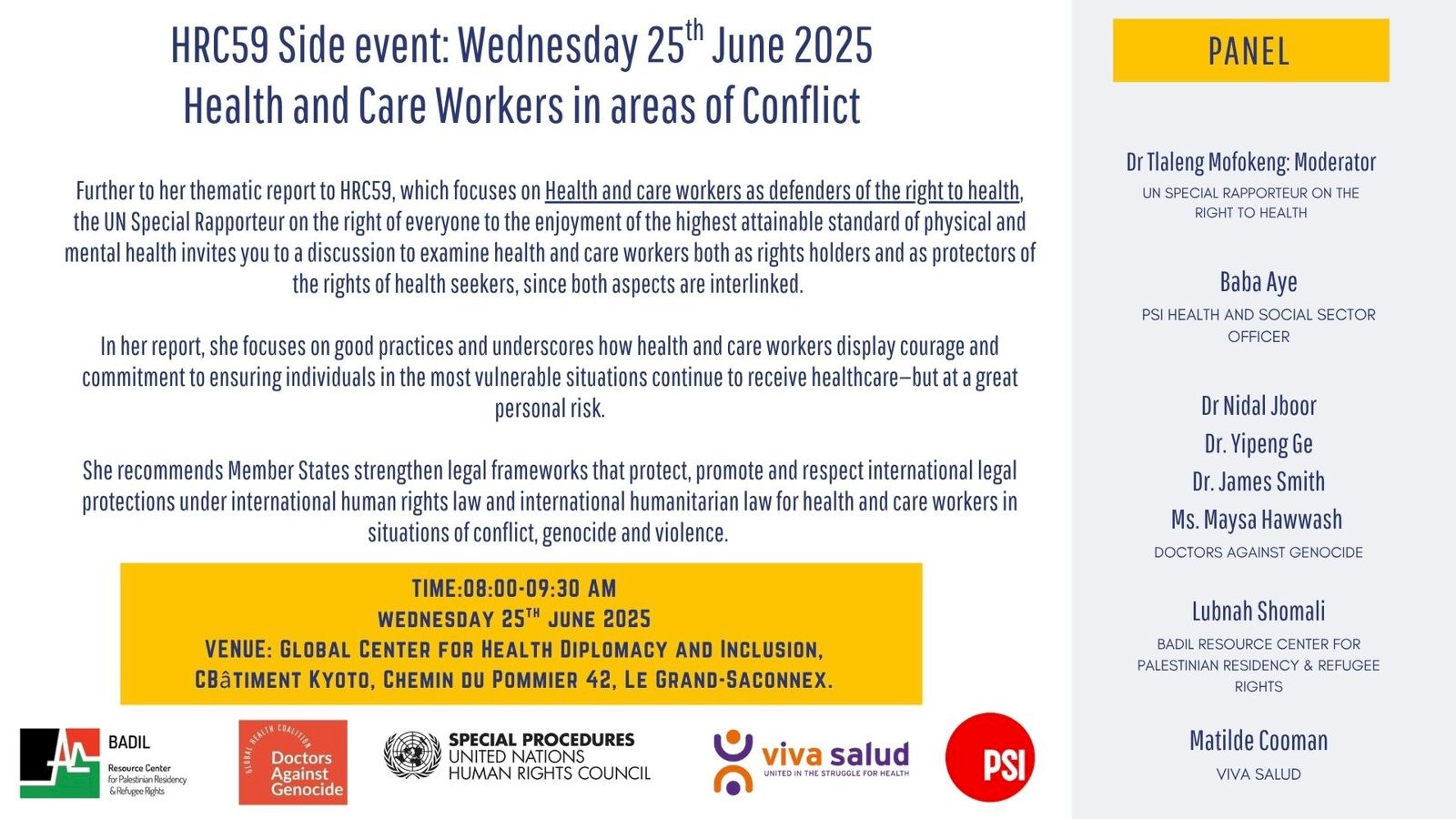 All interventions highlighted that the killing of over 1,600 Palestinian medical workers is not a series of isolated incidents but reflects the three pillars of the Israeli regime: colonization, apartheid, and forced displacement and transfer. “The Israeli attacks against doctors, ambulances and hospitals are not random wartime violations,” said BADIL’s representative. “They are part of a decades-long pattern rooted in a system of structural violence and domination.”