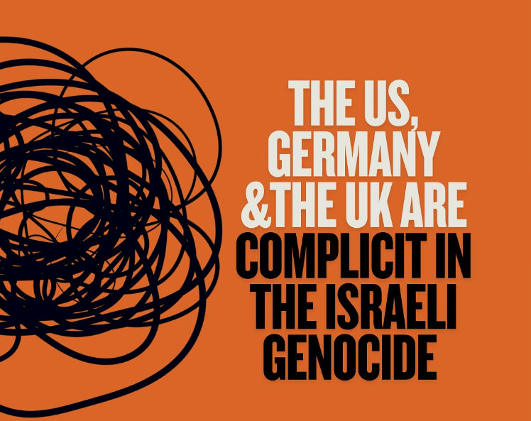 The brochure demonstrates how western, colonial states—particularly the United States, United Kingdom, and Germany—have enabled the Israeli regime’s genocide on Gaza since October 2023 with their military and politicial complicity.