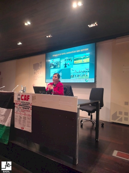 BADIL also meet with the solidarity and feminist movements of the Basque Country, stressing that the escalation of direct actions to end complicity with the Israeli regime by severing academic, athletic and economic relationships is required. Specifically, public talks and meetings were held with the Basque BDS movements of Bilbao (Bizkaia), Gasteiz (Araba), Donostia (Gipuzkoa), and Iruña (Nafarroa). Discussion centered on the practical measures needed to ensure the full liberation of Palestine and reparations for its people, in order to achieve return and justice.