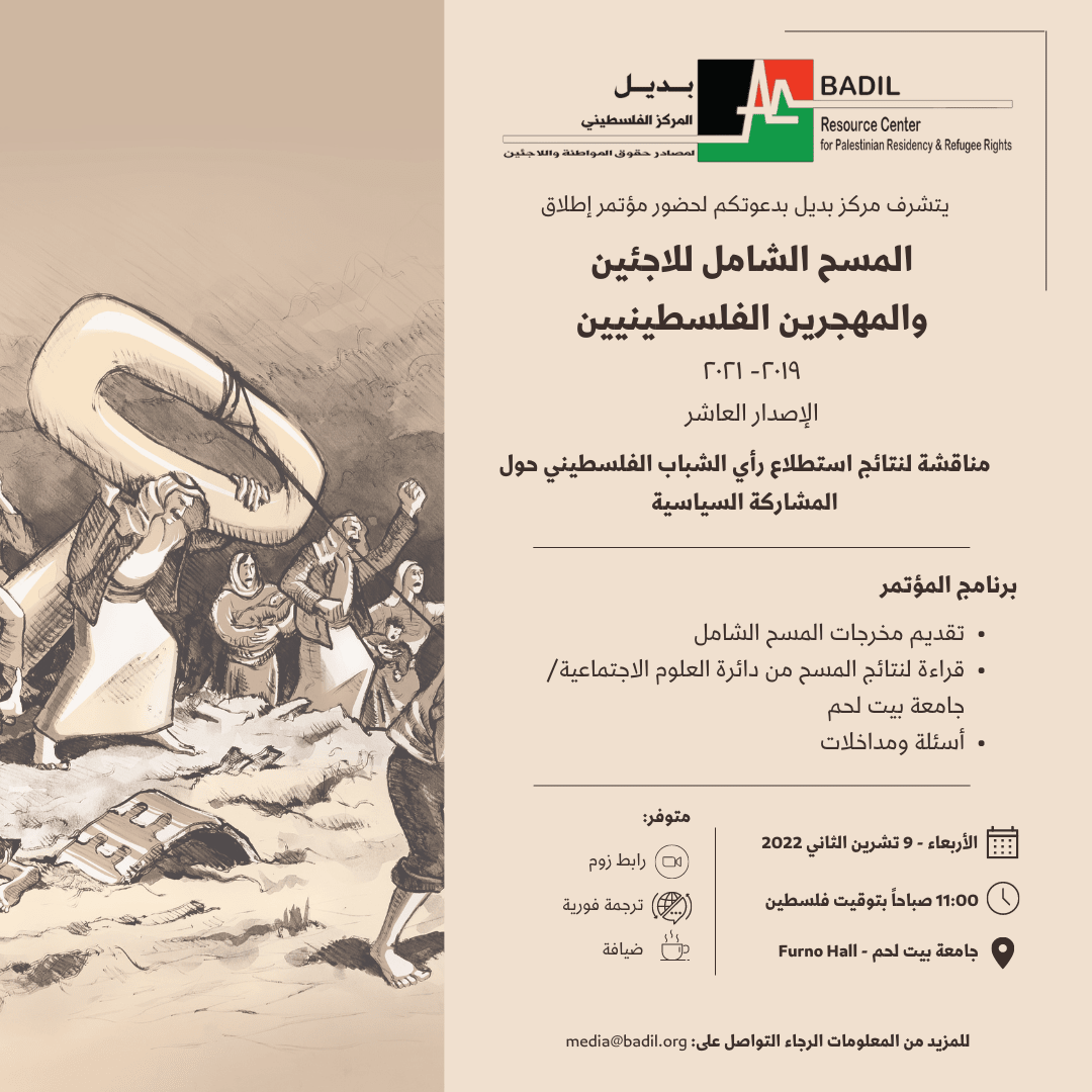 سيتم إطلاق المسح الشامل للاجئين والمهجرين الفلسطينيين 2019 – 2021 ونتائج استطلاع رأي الشباب الفلسطيني حول المشاركة السياسية في مؤتمر صحفي بتاريخ 9 تشرين الثاني 2022.