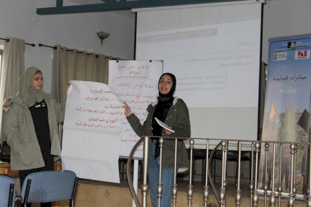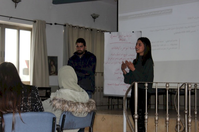 وقد تخللت اللقاءات مجموعة من التدريبات المهاراتية والتثقيفية التي تهدف إلى رفع الوعي العام بقضية اللاجئين والمهجرين الفلسطينيين، والتي تناولت مواضيع سياسات التهجير القسري المستمر، وحقوق اللاجئين والمهجرين الفلسطينيين في القانون الدولي، والهوية الفلسطينية وسياسات التجزئة المفروضة على الشعب الفلسطيني بفعل الاستعمار، وموضوع التطبيع وأهدافه، بالإضافة الى عدد من مجموعات العمل والجولات التي تم تنفيذها في المناطق التي تقع تحت وطأة التهجير ومخيمات اللاجئين في بيت لحم.